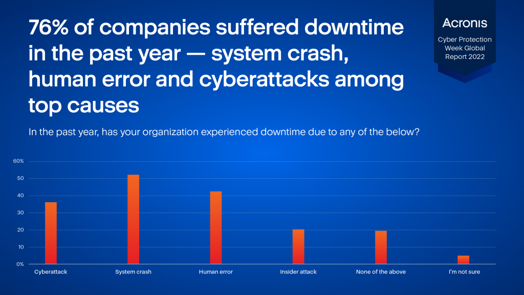 This year, we see that trend getting worse: while 78% of organizations globally run as many as 10 different solutions, 76% of organizations experienced downtime due to data loss — a 25% increase from 2021. This downtime stemmed from a number of sources, including system crashes (52%), human error (42%), cyberattacks (36%) and insider attacks (20%).