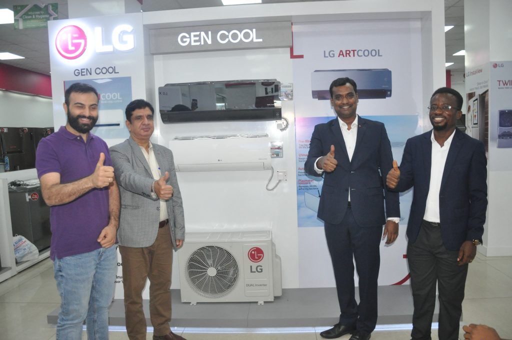 PIX 1-2 L-R: Branch Manager, Lekki Showroom, Fouani Nigeria Limited, Mr. Loual Akil, Manager, Commercial Air Conditioner, LG Electronics, West Africa Operations, Mr. Vijay Bakshi, Head of Corporate Marketing, LG Electronics West Africa Operations, Mr. Hari Elluru and Senior Marketing Manager, LG Electronics West Africa Operations, Mr. Paul Mba at the official launch of new GENCOOL Multi Step Control air conditioner in Victoria Island, Lagos today.